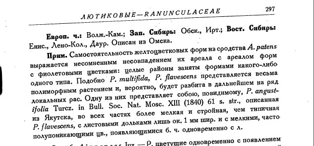 Если бы я был уверен, что красноярские прострелы совершенно точно другой вид, то я бы не упоминал Pulsatilla flavescens совсем, либо при упоминании добавил "excl. typo". Этого я не сделал не случайно. Осталась бы номенклатурная проблема с этим названием . Да, сейчас она решена, возможно, временно. Но это лучше, чем желтые азиатские прострелы притягивать "за уши" к чему попало. Причем разные ботаники вынуждены были это делать независимо от таксономических предпочтений.