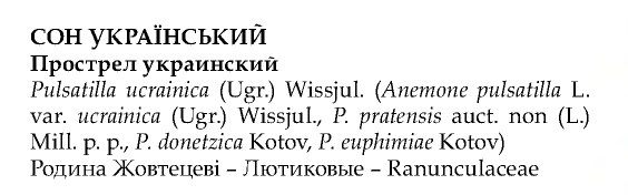 стр. 566 - СОН ЛУЧНИЙ - (С. ЧОРНІЮЧИЙ, С. бОГЕМСЬКИЙ) Pulsatilla pratensis (L.) Mill. s.l. (incl. P. bohemica (Skalický) Tzvelev = P. pratensis (L.) Mill. subsp. bohemica Skalický; P. dacica (Rummelsp.) Tzvelev; P. donetzica Kotov; P. nigricans auct. non Stöerck, nom. illeg.; P. ucranica (Ugr.) Wissjul.)