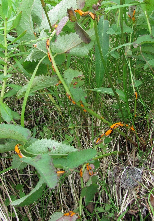 | Vladimir Ivanov | На фотографии у Андрея Любченко изображены личинки первого возраста каких-то жуков-нарывников (сем. Meloidae), вероятнее всего, из маек (род Meloe). Они после выхода из яиц забрались на растение в ожидании пчелы, чтобы уцепиться за неё и попасть в гнездо, где будут питаться расплодом. Вот только растением, похоже, ошиблись и пчелы не дождутся. |