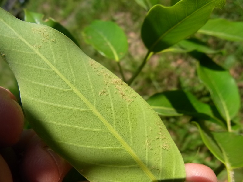 На листе такая как войлочная оболочка, не соединённая с поверхностью, совсем молодые листья и побеги были покрыты ей целиком, но туда я не дотягивалась... |