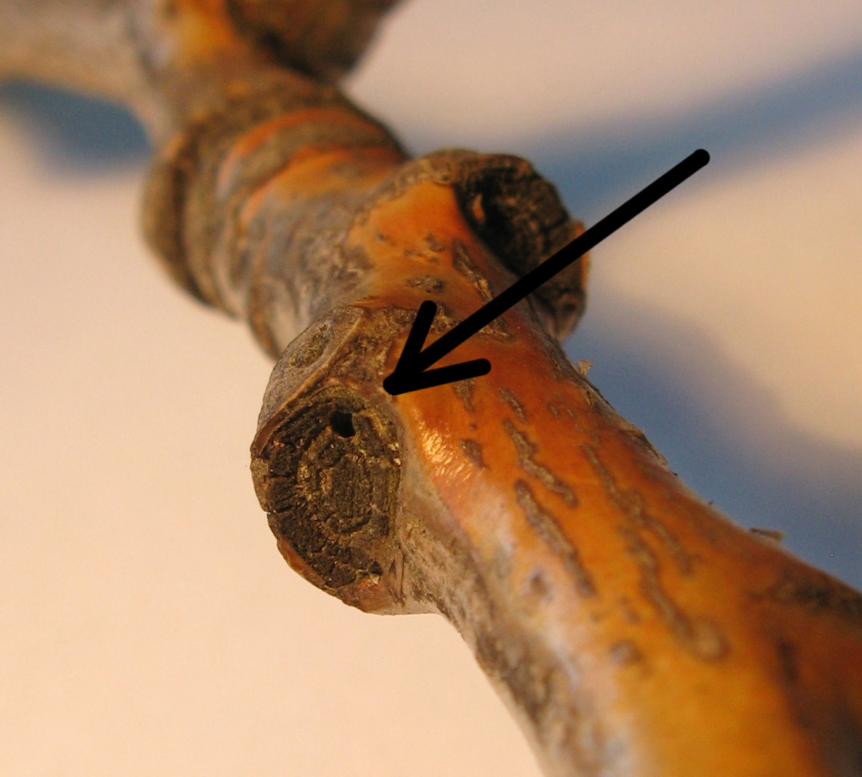 | Tatyana Nikulina | Подскажите, пожалуйста, как мне описать следующее морфологическое образование на побеге тополя. Это место, в котором от побега "отвалился" другой побег - я так понимаю, для тополей это нормально, сначала это выглядит так: