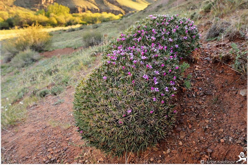 Фото сделано в юго-вост. Казахстане, в долине реки Ассы, характер местности опустыненные эродированные горы, растение колючее, кустики шаровидные, высотой около 20-25 см. |