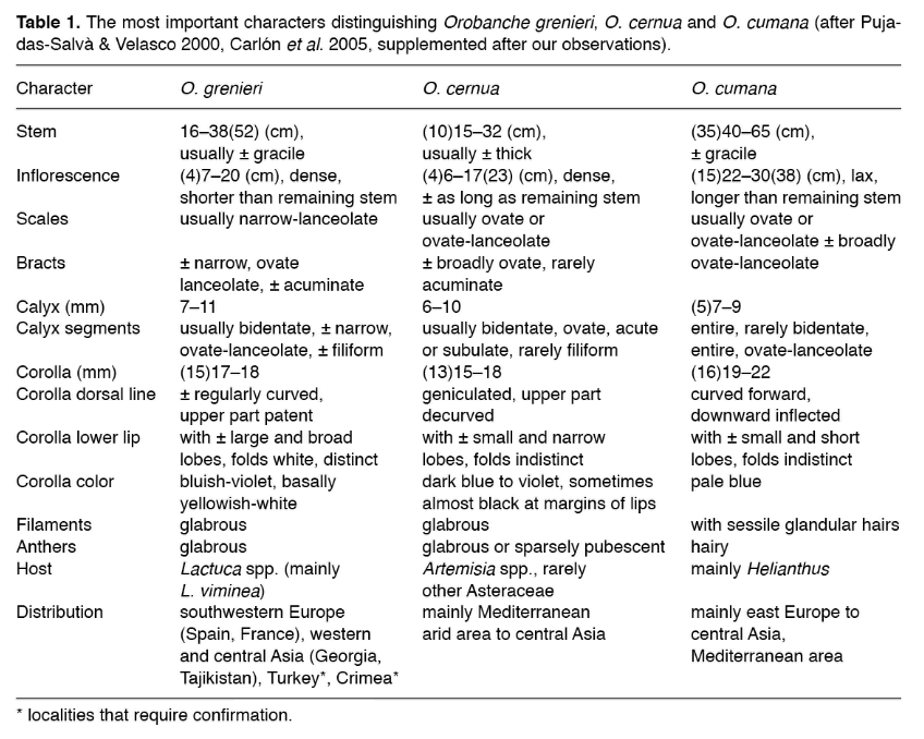 | Alexander Fateryga | Здесь пишут, что, все же, в основном этот вид паразитирует на подсолнечниках, а на полынях - O. cernua. У нас же большинство фото O. cumana на полынях. Надо бы пересмотреть их, согласно данной таблице. И в будущем снимать опушение тычинок.