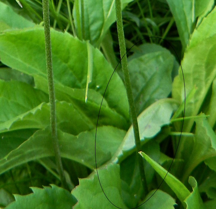 | Denis Mirin | Ага. Листья под соцветием Plantago media - Solidago virgaurea, справа среди листьев золотарника - листья другого растения подорожника (Plantago lanceolata) - не того, чьи соцветия. |