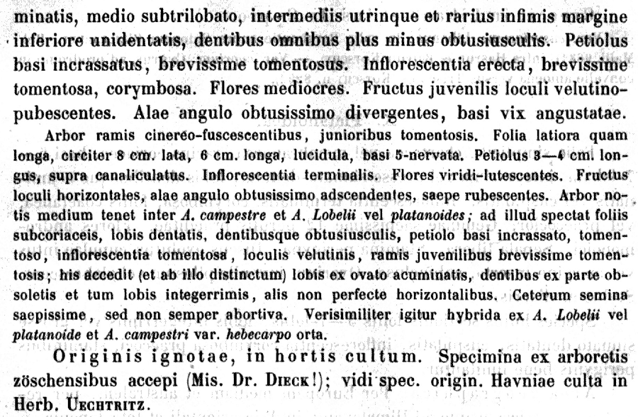 "Возникший в культуре гибрид, происхождение которого точно не установлено. Одним из родителей является Acer campestre, вторым - A. cappadocicum либо A. lobelii"