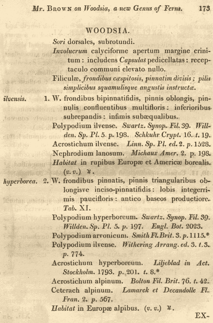 | Andriy Kovalchuk | Протолог рода Woodsia R.Br. (Prodromus Florae Novae Hollandiae et Insulae van-Diemen 158, obs. IV. 1810 [27 Mar 1810]; lectotype (designated by J. Smith in Historia Filicum: 237. 1875): Woodsia ilvensis (L.) R.Br. (≡ Acrostichum ilvense L.):