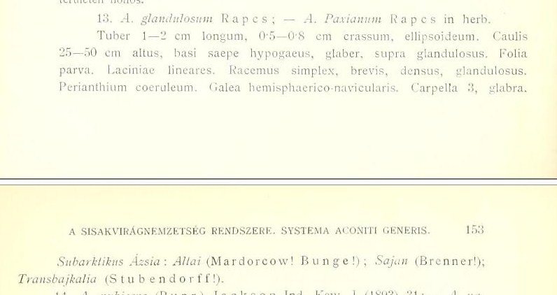 Протолог Aconitum glandulosum Rapaics (Növʹenytani közlemʹenyek 6: 152(-153). 1907):
