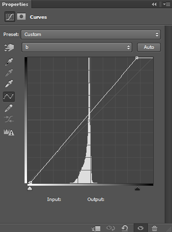 Для коррекции создал корректирующий слой Curves, переключился в канал b и сдвинул жёлтый (правый) край кривой влево (чтобы убрать избыток жёлтого), а синий (левый) - совсем чуточку вправо (чтобы усилить жёлто-синий контраст).