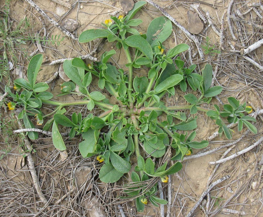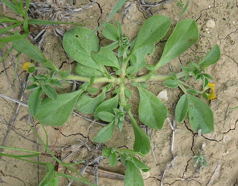 Очень симпатичная форма роста - все побеги молодых растений образуют лежащий на земле плоский ромб. На концах побегов - микроскопические жёлтые цветочки. И уже распускаются взрослые листья - сложные.