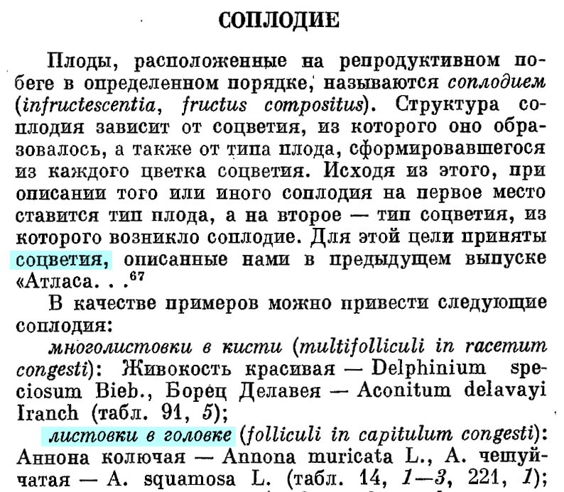 А все равно Баба-Яга против! Tongue image В вышеупомянутом "Атласе..." плоды (est!) Annona squamosa и A. muricata названы соплодиями -- "листовки в головке". И латынь для убедительности добавлена! Я на "головку" и купился по первому прочтению. Не каждый день цветки Annonaceae видишь... Hmm image Это "тщательнейшая проработка применяемой терминологии"? Я сам Атласы по описательной морфологии уважаю. Но не в этом месте. Когда я говорю "структура", то имею ввиду общий план строения: "Взаиморасположение и связь частей, составляющих что-л. целое; устройство, строение чего-л." (Большой толковый словарь русского языка. Гл. ред. С. А. Кузнецов. СПб.: Норинт, 1998.) "Лично я вообще не испытываю пиетета перед очевидно нелогичной терминологической системой и не вижу смысла цепляться за неё, когда есть более стройная, логичная и эффективная." А это утверждение просто голословно! ПОВТОРЮСЬ. Крайне нежелательно использовать позднейшее и расширенное толкование термина, если без этого можно обойтись. Да, такое регулярно случается. Термины живут по своим законам. Но не следует преднамеренно разрушать существующие смыслы.