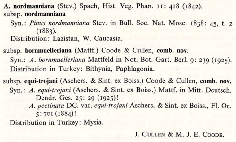 | Andriy Kovalchuk | Обнародование комбинации Abies nordmanniana ssp. equi-trojani (Asch. & Sint. ex Boiss.) Coode & Cullen (Notes from the Royal Botanic Garden, Edinburgh 26: 167. 1965):