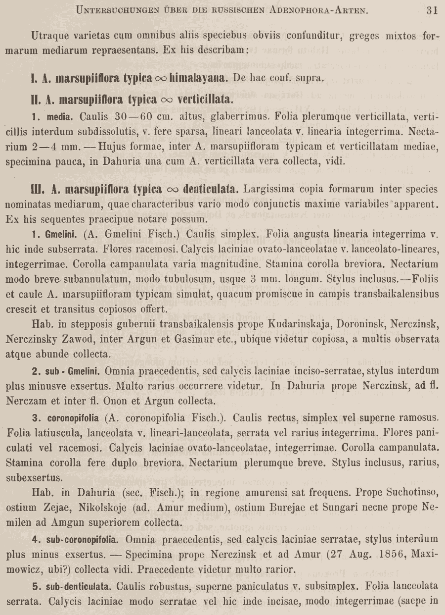 | Andriy Kovalchuk | Коршинский подчинил разновидность crispata не биномену, а гибридной формуле (Adenophora marsupiiflora x denticulata), из-за чего эта комбинация и не считается действительно обнародованной. Даже не знаю, есть ли возможность пристроить такую конструкцию (Adenophora marsupiiflora x denticulata var. crispata Korsh.) в базу. |