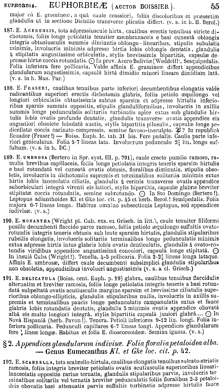| Andriy Kovalchuk | Не совсем понятна ситуация с комбинацией Eumecanthus ariensis (Kunth) Klotzsch & Garcke - в Tropicos она приводится в числе синонимов Euphorbia graminea Jacq., но её базионим - Euphorbia ariensis Kunth - имеет статус самостоятельного вида. Возможно, имеет смысл удалить её из списка синономов.