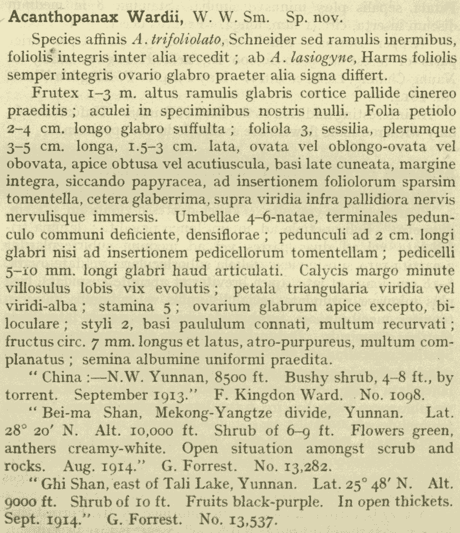 Протолог Acanthopanax wardii W.W. Sm. (Notes from the Royal Botanic Garden, Edinburgh 10(46): 7. 1917):