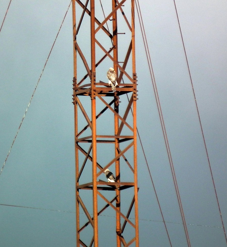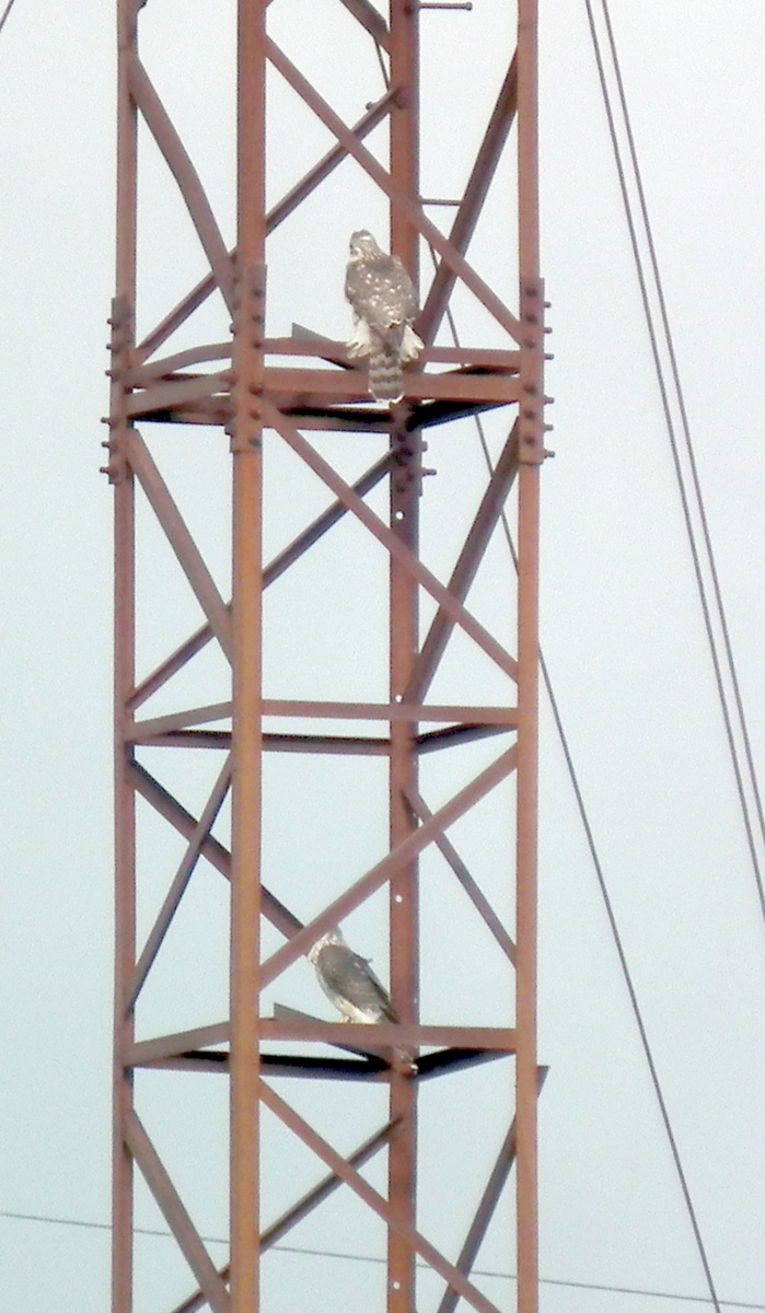 Обычно у меня там живут на опорах кречеты, но сейчас они уже отлетели. Я так понимаю, что, судя по размаху крыльев, это - тетеревятники мальчик+девочка, которые тоже на эту точку претендуют.