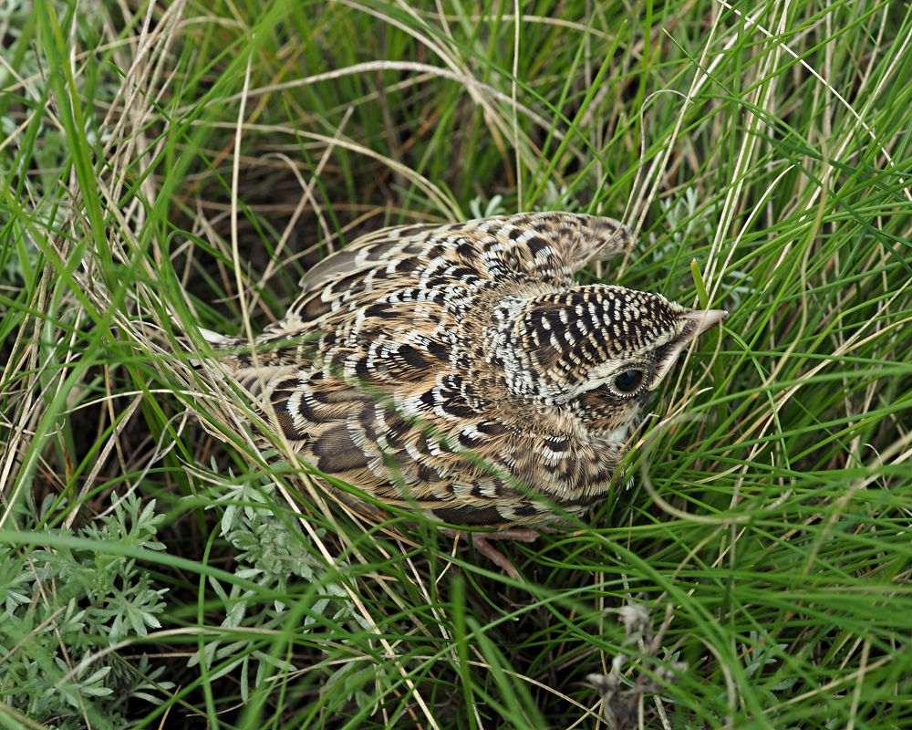 А вот полевой жаворонок обычен, но найти его гнездо почти не реально. Мне этой весной в долине р. Бол. Авраль довелось встретить нелетающего птенца: |