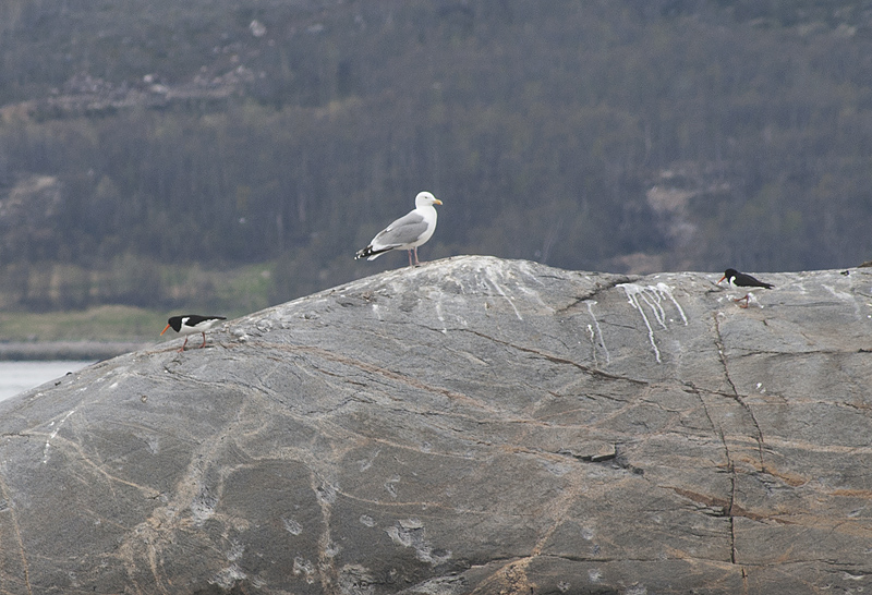 Два кулика-сороки на всякий случай ошиваются рядом с серебристой чайкой. Она большая и страшная.