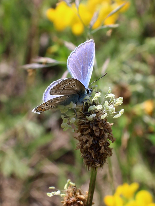 Безобидная голубянка не отказалась попозировать, подкрепляя силы на соцветии подорожника на лугу в Ждановичах, 17.06.2017.