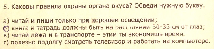 | Pavel Yevseyenkov | Я поначалу подумал что это тест на сообразительность. Российские дети должны ведь понимать где опечатка(?) и что имелось ввиду. Но видимо нет, напротив вопроса №5 учительница недрогнувшей рукой поставила"-", т.е. ответ не верный. Значит 30-35 см не спасают орган вкуса  |