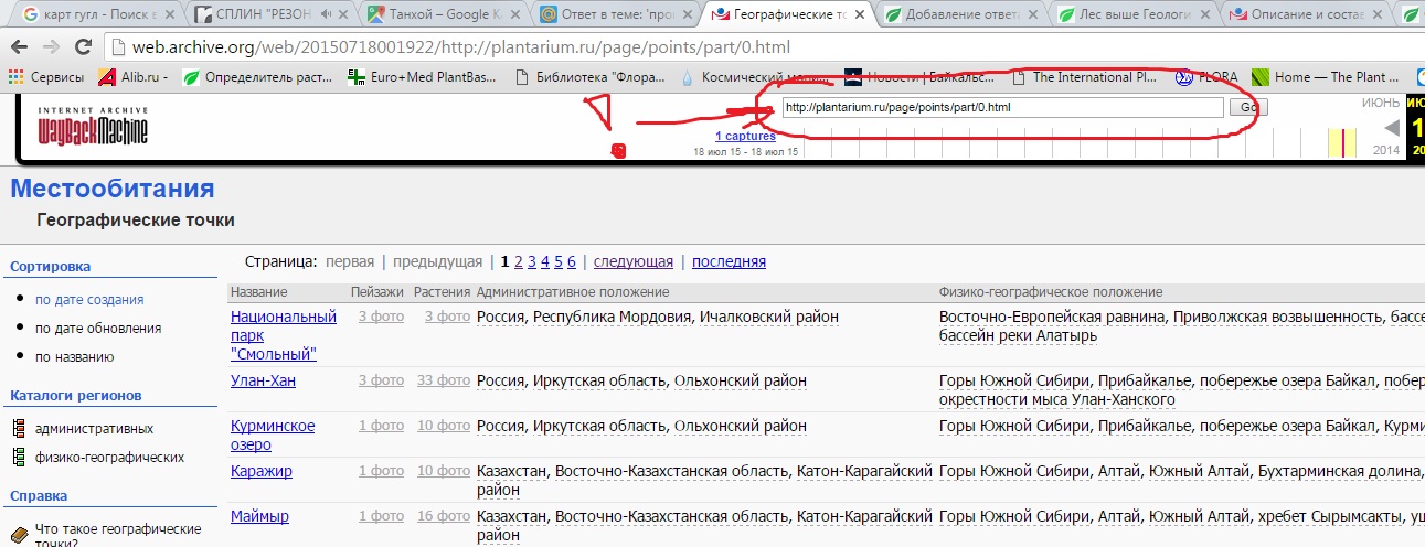 Что имеется в виду? Административное и географическое положение, координаты, описание точки и?.. Как вы восстанавливаете ландшафты? Я вижу в архивах только количество фото и их авторов. Ни подписей, ни намёков на сами картинки  | | Natalia Gamova | в сообщении № 99 (этой темы) написано - на странице архива во внутреннем поисковике его адрес своей текущей страницы геогр. точек нужно вписать - тогда их можно открывать и с ландшафтами, и с растениями. Фото даже если там уже выпали- подписи всё равно есть.