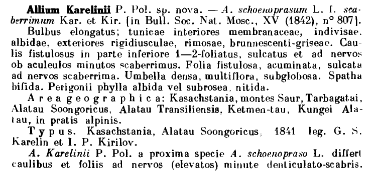 У Allium karelinii есть синоним A. schoenoprasum f. scaberrimum Kar. & Kir. может добавить в базу. Интересно сравнительное фото: A. schoenoprasum -слева, karelinii - справа. Различия не только по ребристо-шершавые или голые листья.