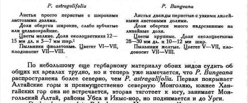 у P. bungeana пыльники желтые, а у P. astragalifolia пыльники фиолетовые.