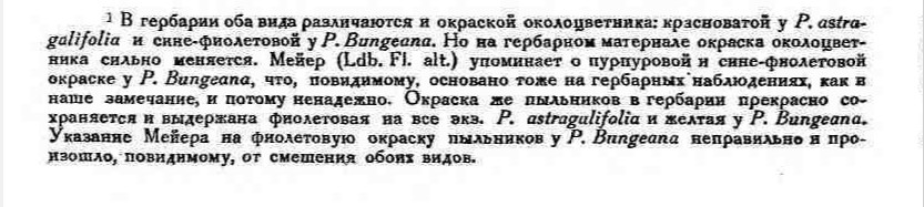 Уверен, примеров таких неточностей можно привести немало. В случае с прострелами, упомяну цвет листочков околоцветника P. angustifolia, отсутствующий в протологе, желтый во Флоре СССР, и фиолетовый во Флоре Сибири. |