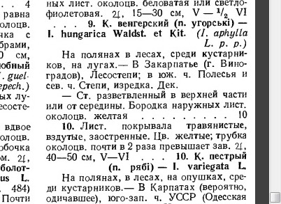 | Andriy Kovalchuk | Владимир, помню, там было интересное обсуждение (жаль, что оно не сохранилось). Почему оно закончилось ничем, я уже написал выше. Думаю, что до тех пор, пока нет ясности, какие ирисы считать "настоящими" I. aphylla, прорывов в этом вопросе ожидать не стоит. Пока-что, наоборот, всё ещё больше запутывается. Так, в нашей Красной книге 2009 г. появился I. furcata с указаниями для Харьковской,, Донецкой и Луганской областей. При этом их отличия никак не комментируются. |