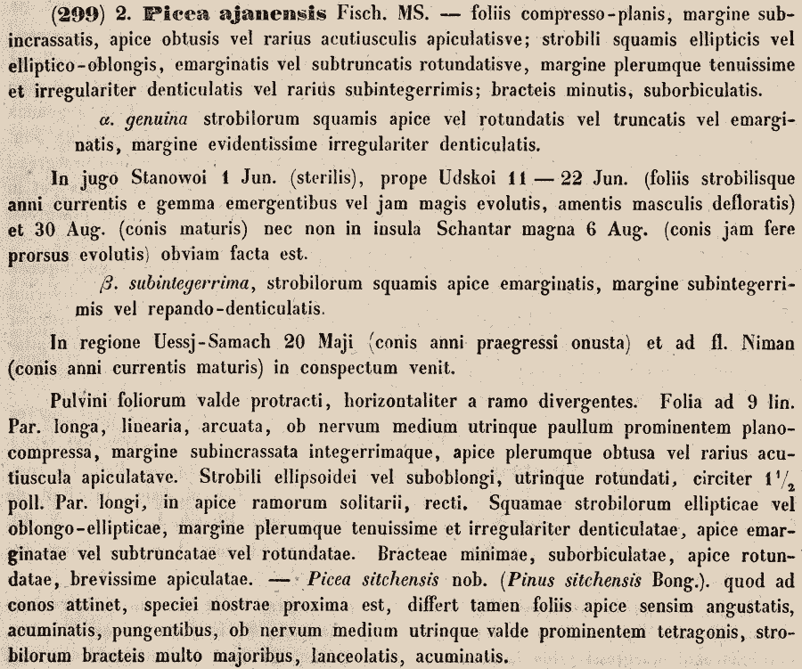 2) комбинация Abies ajanensis Lindl. & Gordon, на мой неискушенный взгляд, является nomen nudum (ну что это за валидирующий диагноз - "A large tree"?) и, в таком случае, я бы исправил авторство комбинации Picea ajanensis (Lindl. & Gordon) Fisch. & Carr. на Picea ajanensis Fisch. ex Carr.