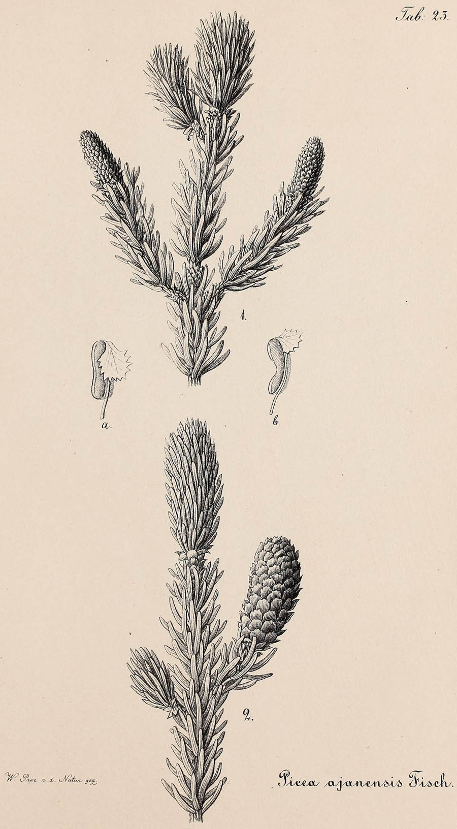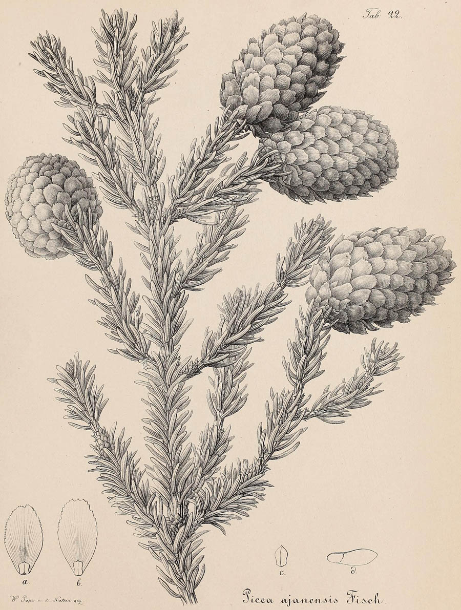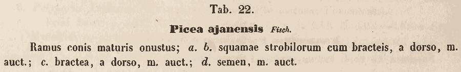 | Andriy Kovalchuk | Описание Picea ajanensis Fisch. ex Carr. и сопровождающие его иллюстрации (Reise in den äussersten Norden und Osten Sibiriens während der Jahre 1843 und 1844, 1(2), Suppl. (Florula Ochotensis Phaenogama): 87, tab. 22-24. 1856):