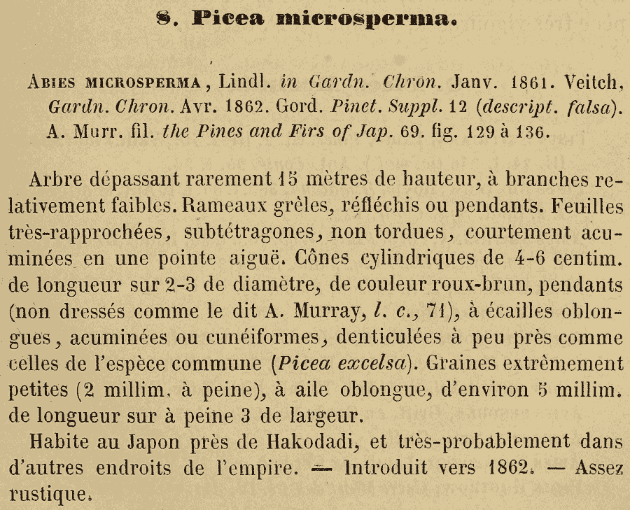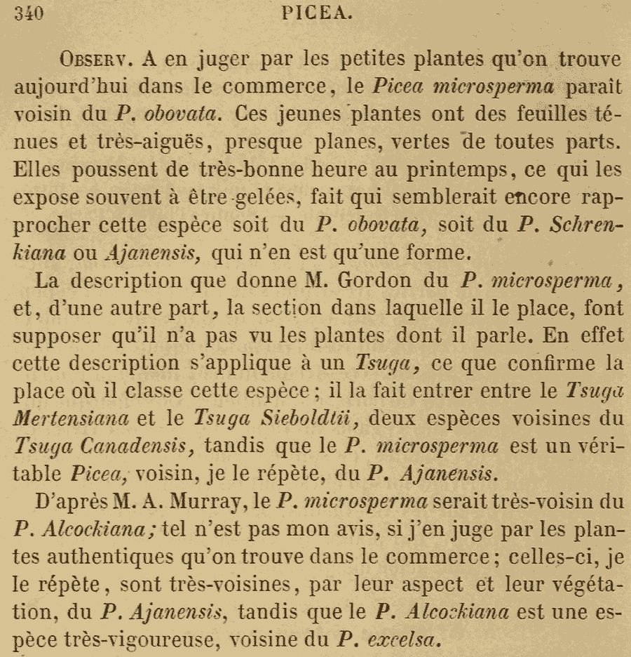 1) комбинация Picea microsperma Carriere, как следует из протолога, базируется на Abies microsperma Lindl., поэтому авторство правильнее было бы указать как Picea microsperma (Lindl.) Carriere;