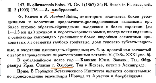 В то же время, во Флоре Азербайджана написано единообразно - эль бурсский, и в описании, хотя оно как бы повторяет таковое из Флоры СССР, сказано "с г. Эль бурс".