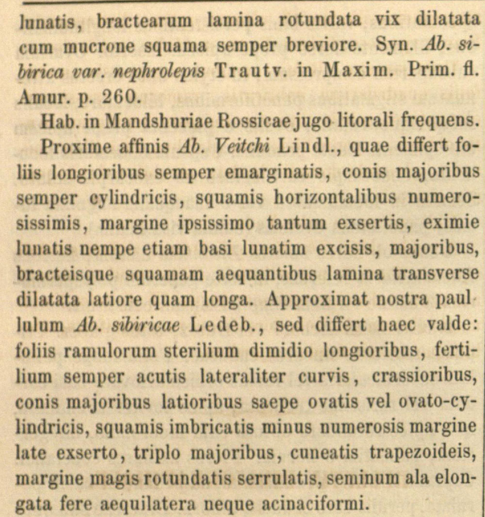 Протолог Abies sibirica var. nephrolepis Trautv. (Mémoires présentés a l'Académie Impériale des Sciences de St.-Pétersbourg par Divers Savans et lus dans ses assemblées 9: 260. 1859):