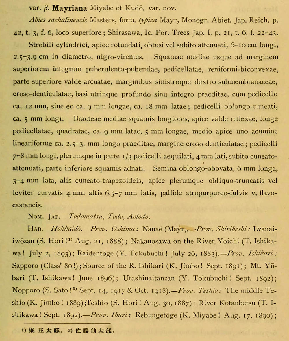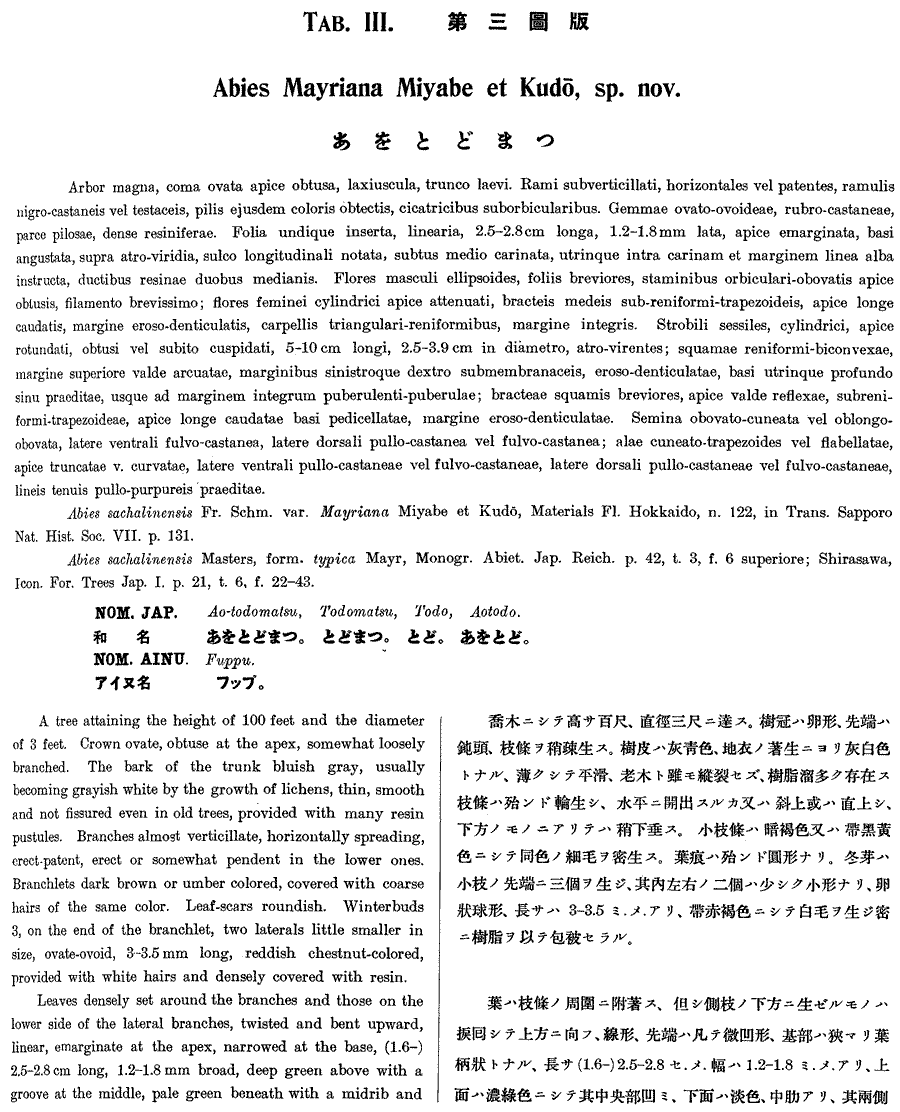 | Andriy Kovalchuk | Обнародование комбинации Abies mayriana (Miyabe & Kudo) Miyabe & Kudo (Icones of the essential Forest Trees of Hokkaido 1: 9, t. 3, 4. 1920):