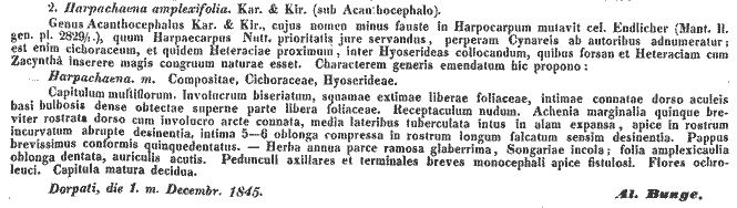 | Andriy Kovalchuk | Обнародование комбинации Harpachaena amplexifolia (Kar. & Kir.) Bunge (Delectus seminum e collectione anni 1845, quae hortus botanicus Dorpatensis pro mutua commutatione offert: [3]. 1845):