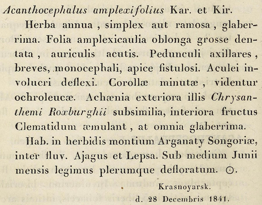 Протолог Acanthocephalus amplexifolius Kar. & Kir. (Bulletin de la Société Imperiale des Naturalistes de Moscou 15: 128. 1842):