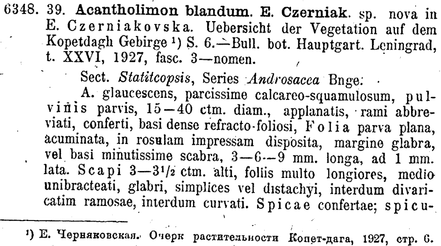 | Andriy Kovalchuk | И, для полноты картины, фрагмент из "Очерка растительности Копет-Дага", в котором впервые используется название Acantholimon blandum ((Известия Главного ботанического сада СССР 26: 255. 1927  :