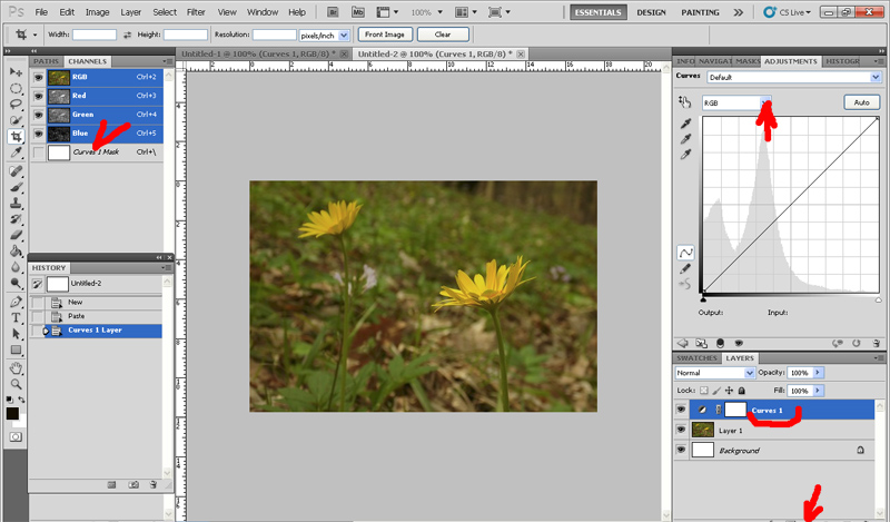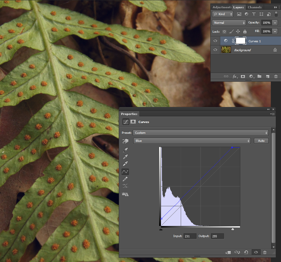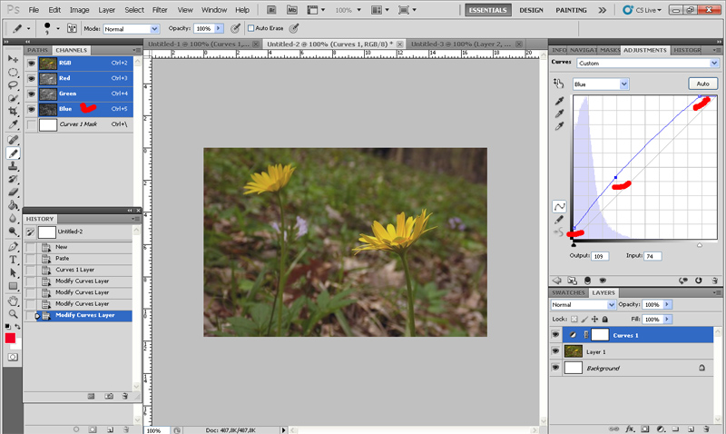 Создаём корректирующий слой кривых (справа внизу щёлкаем по кружку, наполовину, закрашенному чёрным, и выбираем в списке Кривые/Curves). В окне гистограммы справа вверху выбираем синий канал и применяем к нему осветляющую кривую. Ставим точки и изгибаем кривые как-то так. Ориентироваться нужно на результат. Поскольку провал в синих тенях, их поднимаем. Светлого синего тоже нет, в светах тоже поднимаем. Ну и середину выгибаем так, чтобы цвета оставались натуральными (это позволит "разогнать" цвета, сделать больший контраст). Кривая д.б. самой крутой на том участке, где гистограмма показывает максимум.