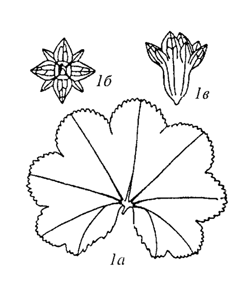 Рисунок Н.Н. Сычак из 10-го тома Флоры Восточной Европы, стр. 509: а) прикорневой лист; б),в) цветки.