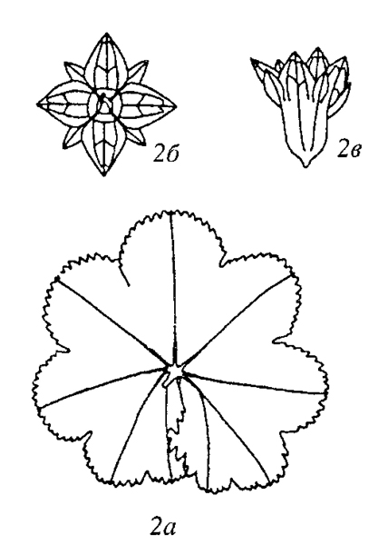 Рисунок Н.Н. Сычак из 10-го тома Флоры Восточной Европы, стр. 509: а) прикорневой лист; б),в) цветки.