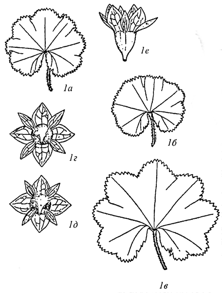 Рисунок Н.Н. Сычак из 10-го тома Флоры Восточной Европы, стр. 513: а), б), в) прикорневые листья; г), д), е) цветки.
