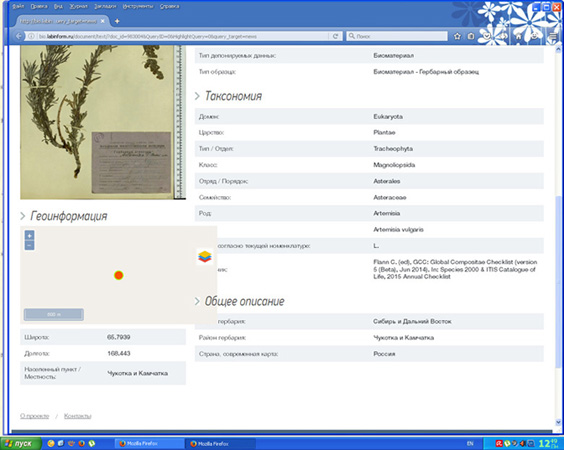 Содержит 501,892 скана образцов из отделов Восточной Европы и Сибири-Дальнего Востока. Поиск по районам гербария пока недоработан. Сортировка на больших выборках виснет. Будем считать, что это альфа-версия.