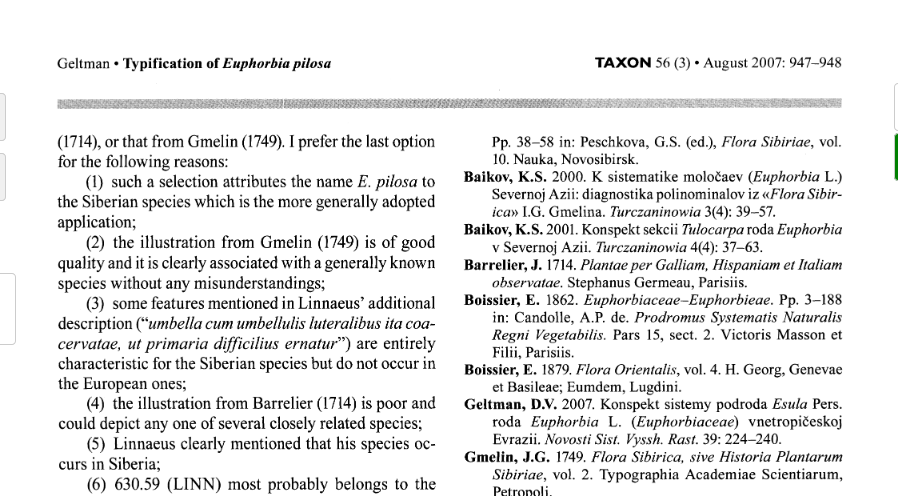 | Andriy Kovalchuk | Гельтман упоминает в статье о мнении Байкова по этому вопросу. Отменить лектотипификацию и выбрать новый тип, теоретически, можно, но для этого должны быть веские основания. Сама статья Д. В. Гельтмана доступна здесь: http://www.jstor.org/stable/25065877 |