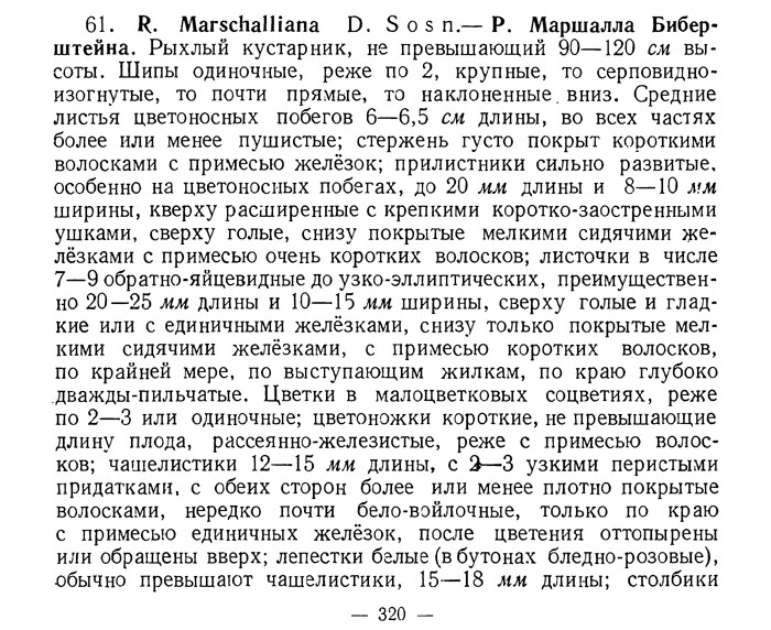 Обсуждаемое отнести к - Rosa leucantha M. Bieb., которая у нас - Rosa biebersteiniana?, или ещё что уточнить? | | Сергей Банкетов | С этим видом (Rosa marschalliana) все очень "запущено". У Галушко этот вид в цикле Corymbiferae, вместе с канина и коримбифера. Т.е. незначительно отличимая от канины. В описании указано что железки есть рассеяно или только по жилкам. Но железки мелкие и без аромата!