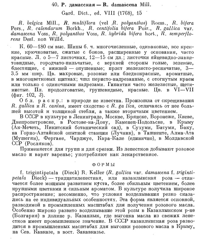 | Сергей Банкетов | Есть еще R. bifera Poir. Роза ремонтантная. По ключам от дамасской отличается голыми листочками и рахисом. Цветки красные и темно красные, в отличие от дамасской (у которой лепестки бледно красные или розовые). |