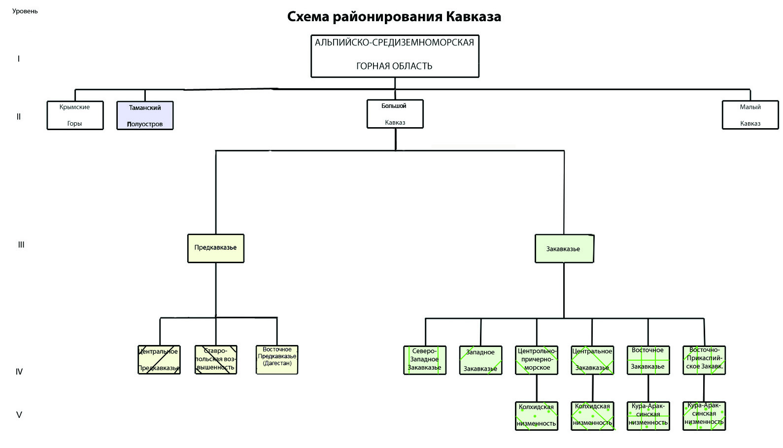 А. Она опирается на естественные природные различия между выделяемыми структурными единицами Кавказа. Так на каждом предлагаемом в данной схеме уровне между обособляемыми регионами существуют коренные различия по такому комплексу факторов, как:
