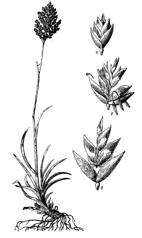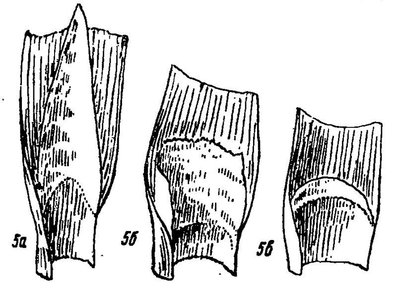 Форма и величина язычка молодого листа в верхней части стебля (а), в средней части стебля (б) и прикорневого листа (в).