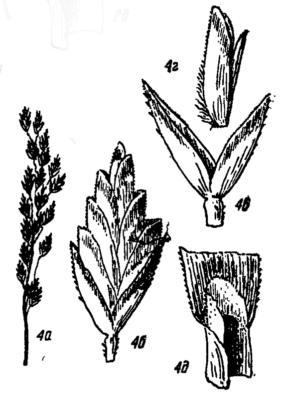 Рисунок Н.З. Семёновой-Тян-Шанской из 1 тома "Флоры Мурманской области" (стр.207): а) метёлка; б) колосок; в) колосковые чешуи; г) цветочные чешуи; д) листовое влагалище с язычком.