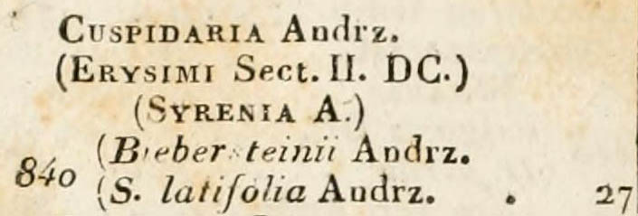 Обнародование родового названия Cuspidaria (DC.) Bess. (nom. rej.) (Enumeratio plantarum hucusque in Volhynia, Podolia, Gub. Kiioviensi, Bessarbia Cis-Tyraica et circa Odessam collectar: 104. 1822):