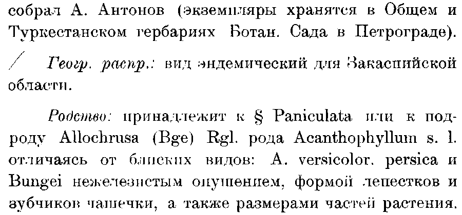 Протолог Acanthophyllum transhyrcanum Preobr. (Notulae Systematicae ex Herbario Horti Botanici Petropolitani / Ботанические материалы Гербария Главного Ботанического сада РСФСР 1(3): 1(-3). 1920):